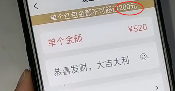现在很多人用的最多的就是这个微信红包,这个微信红包它是有金额限度的,像我们如果发300块钱的话,发300试一下,发300的话,它会出现一个提示,单个红包金额不能超过200钱,意思就是说红包单个金额最高是200块钱。