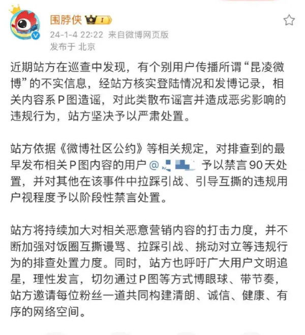随后围脖侠也发布声明,经站方核实登录情况和发博记录,相关内容系p图造谣,已排查到p图用户,给与禁言90天处置