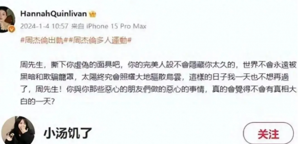 1月4日昆凌微博发文,斥责周杰伦虚伪,出轨后秒删,内容为:周先生,撕下你虚伪的面具吧,你的完美人设不会隐藏你太久的,世界不会永远被黑暗和欺骗笼罩,太阳终究会照耀大地驱散乌云,这样的日子我一天也不想再过了,周先生!你与你那些恶心的朋友们做的恶心的事情,真的会觉得不会有真相大白的一天?