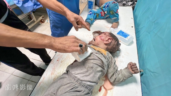 当地时间11月6日,巴以冲突持续,以色列持续空袭加沙地带,受伤的巴勒斯坦民众被送往希法医院。图自澎湃影像