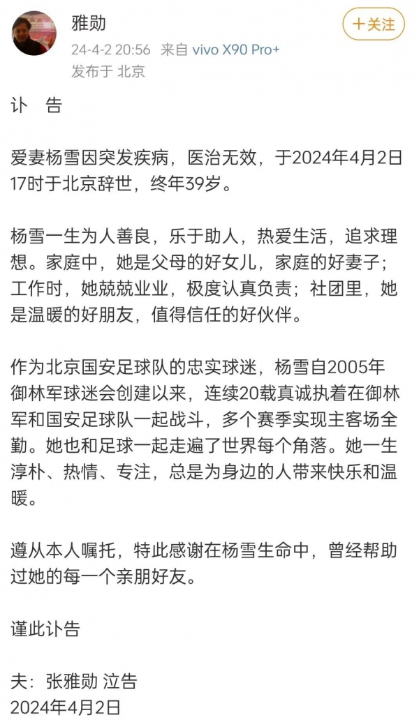 4月2日晚,张先生发布讣告称,当天下午杨雪离开了这个她热爱的世界,此时距她确诊仅仅4天。