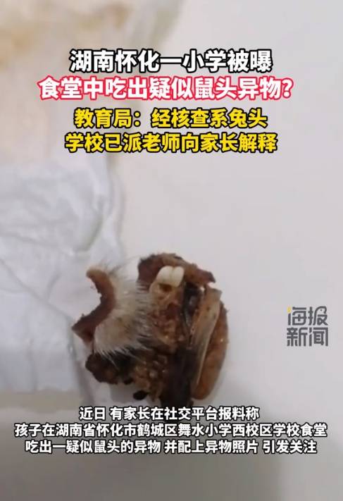 11月9日,据海报新闻报道,近日有家长在社交平台上称孩子在湖南省怀化市鹤城区舞水小学西校区学校食堂吃出一疑似鼠头的异物,并配上异物照片,引发关注。
