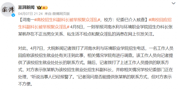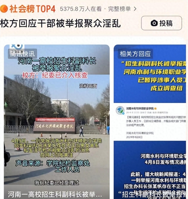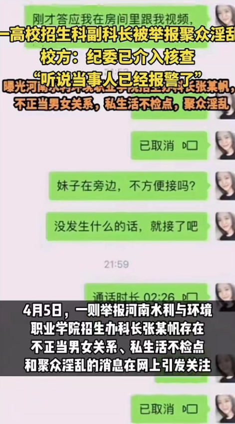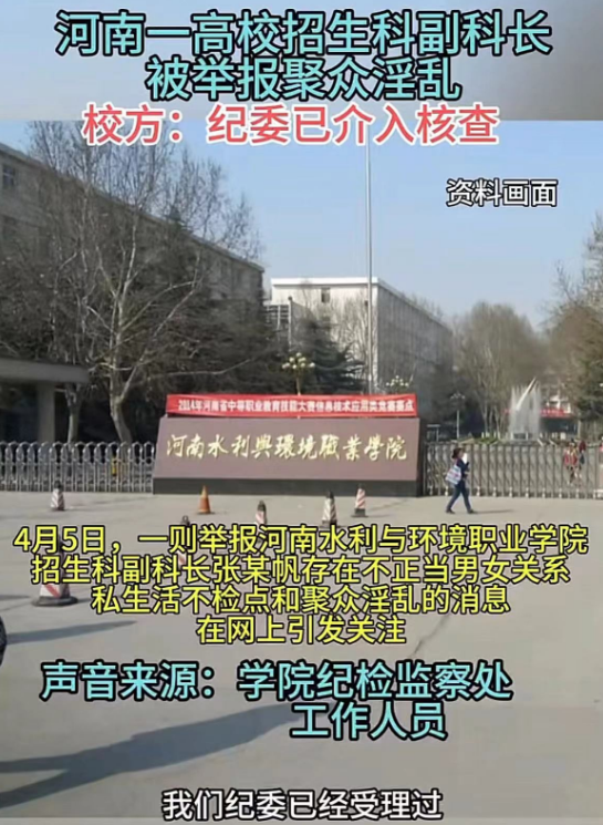 河南水利与环境职业学院招生科副科长张某帆被举报聚众淫乱一事,在4月初的一个普通工作日里,如同一颗重磅炸弹在社交网络上炸开了锅。这起事件源于一份举报材料,其中详细列出了张某帆与多名女性之间的不正当关系,以及涉嫌聚众淫乱的种种行为。