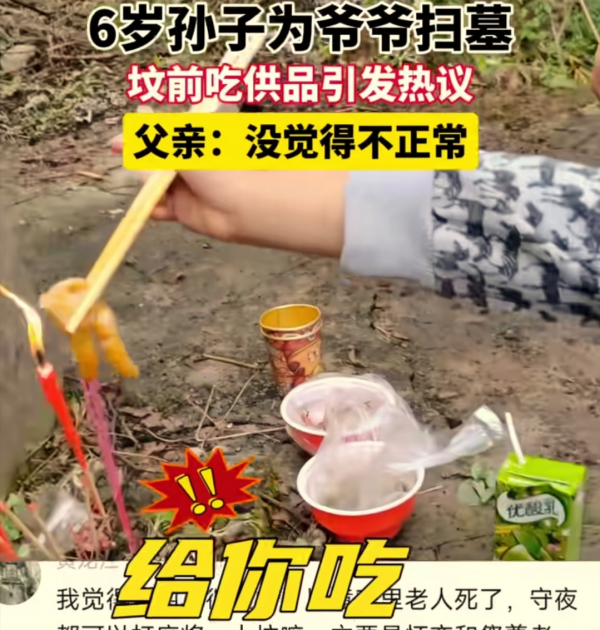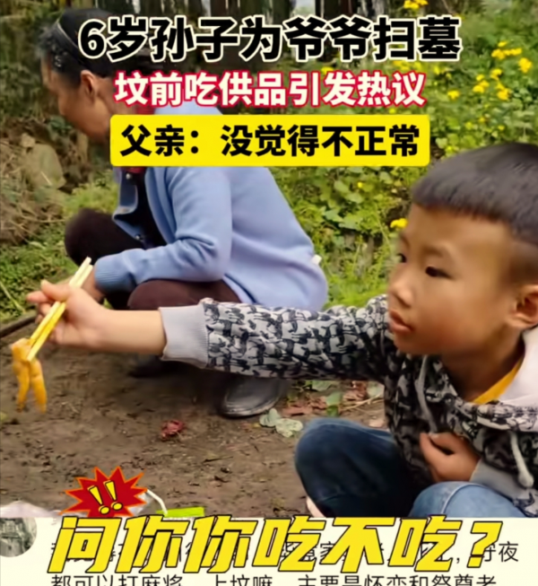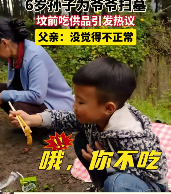 男童在爷爷坟前吃供品引争议 父亲回应