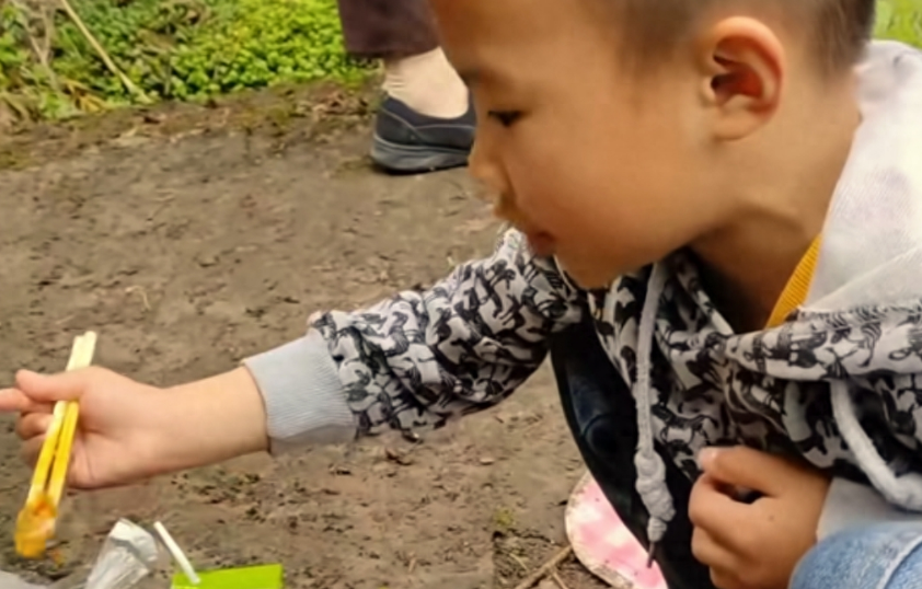 小男孩用筷子夹起一块贡品,对着爷爷的墓碑说:"给你吃!" ,"吃不吃?","哦,你不吃"!