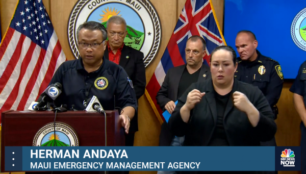 毛伊岛官员在8月16日的发布会上应对记者尖锐的提问,话筒前为当地应急管理部门负责人安达亚