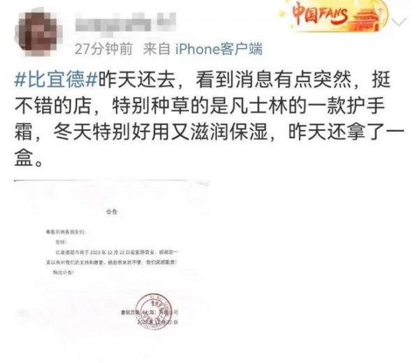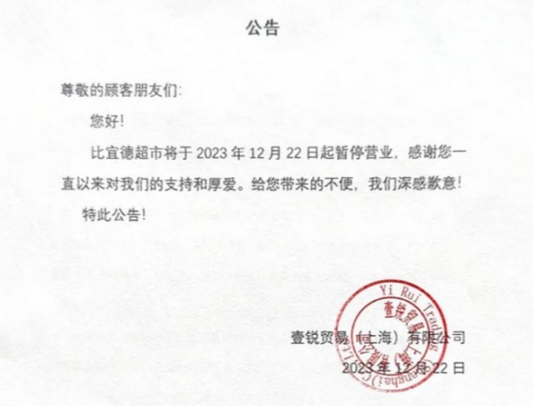 昨天(12月23日)比宜德微信公众号推送比宜德超市于2023年12月22日起暂停营业
