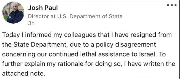 18日,美国国务院负责监督武器转让政治军事事务局主任乔希·保罗(Josh Paul)在社交媒体账号宣布辞职。在公开辞职信中,保罗称自己"无法承受因军援以色列产生的道德妥协",并尖锐地批评美国政府向以色列提供致命武器的决定"具有破坏性、短视、不公正"。