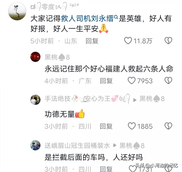 有网友表示大家要永远记得热心的救人司机刘永缙,他救下了6条人命,好人有好报,好人一生平安,他是一个英雄!