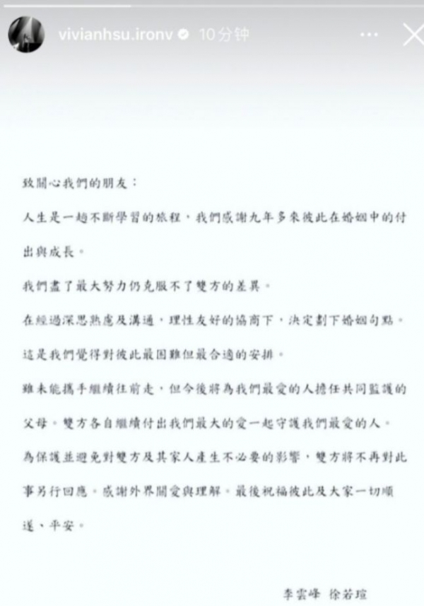 稍晚些时候,徐若瑄李云峰双双发文官宣离婚。