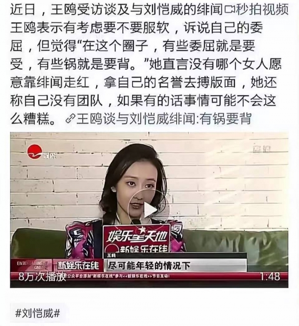 当时王鸥在采访中否认了与刘恺威的绯闻,"有考虑要不要服软,诉说自己的委屈,但觉得在这个圈子里,有些委屈就是要受,有些锅就是要背"。