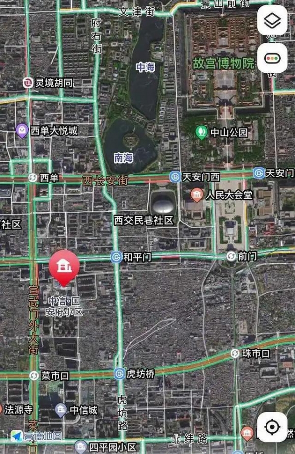 中信国安府二期位于西城区二环里的宣武门,距离天安门仅1.5千米,距离国家大剧院880米,距离金融街1.8千米左右,毗邻西单、 大栅栏等商圈,相比于今年初另一西城区新盘中信城四期更靠近城中心,小区顶层的房子甚至可以俯瞰故宫。