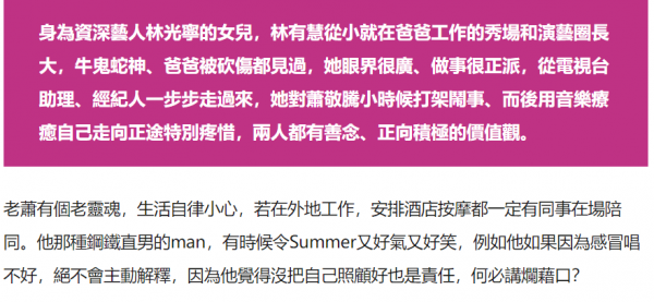 在工作上,林有慧不再给萧敬腾意见,因为所有的事情,他都有自己的看法,经纪人这个角色,从主导改变成迁就包容。