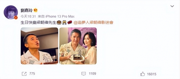 6月27日,香港著名女演员刘嘉玲通过微博给老公梁朝伟送上了生日祝福,并晒出了两张庆生照,夫妻手捧生日蛋糕,紧紧地贴在一起,感情非常融洽,老夫老妻如同热恋中的情侣,恩爱甜蜜令人羡慕不已。
