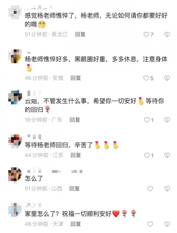 因此视频曝光后,网友们纷纷在评论中询问,发生什么事了,并担忧地提醒杨云无论如何要注意身体,好好休息。
