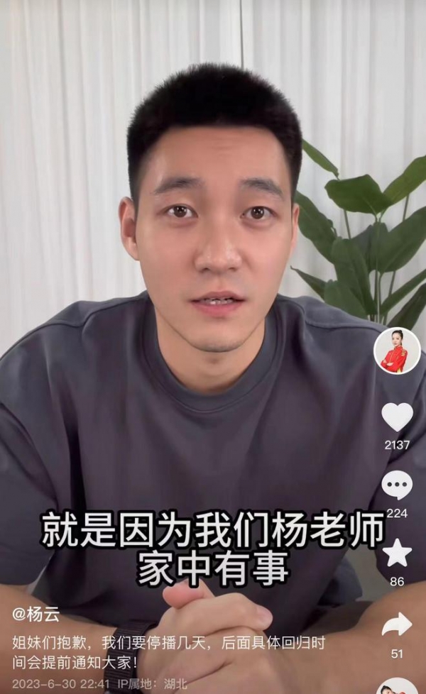 然而6月底杨云突然暂停直播。平日里和她一起跳操的男助播罗杰出现在镜头里,并遗憾地表示杨云家中有事,所以要停播几天。