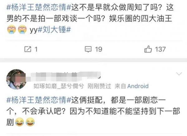 最后,有料君认为,杨洋出道多年,一直都是单身的状态,虽然与不少女明星都传过绯闻,但都没有承认过,如今他已经31岁,即使恋爱,也是很正常的事情,就是王楚然还在上升期,这波是否会影响王楚然以后的前途,还是要看看以后的走势了。