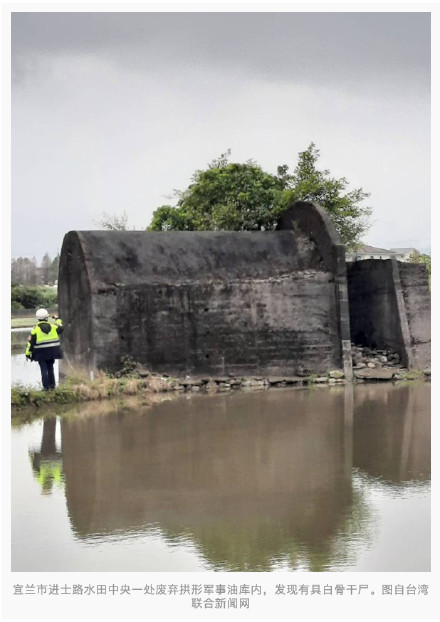 据ETtoday新闻云报道, 2日下午4时许,宜兰有民众在水田一处废弃的拱形军事油库建筑中发现有一具仅剩白骨的遗体,吓得跑去告诉里长,当地警方获报赶到,从现场留下的衣服看,分析死者应是一名男性。