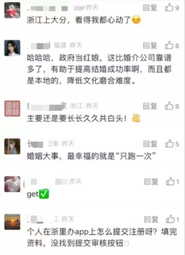 值得一提的是,上游新闻记者在填写资料时发现,在该平台上注册认证时,需要填写详细的个人信息,除了年龄、身份证、身高体重、婚姻状况等基本信息外,还包括工作单位、联系方式等,平台还会提醒"会跟公安厅的接口进行数据比对,也会保护大家的隐私"。据潮新闻报道,"亲青恋"平台已对接民政、人社、教育、司法、公安、发改等浙江省6个部门的大数据,第一时间进行信息认证,核实会员情况。只有通过了这些认证,才能成为"已认证会员",也才能享受到筛选、速配、推荐等服务,不然只能以访客身份浏览信息。对此网友也留言评论,"这些信息就很真实了""官方严选,值得信赖!"记者随机点开一名用户资料,看到她的基本信息为30岁,身高1米58,体重42公斤,住在余杭区,月薪5000-10000元,并显示"平台已认证""手机已认证""婚姻已认证""学历已认证"。她希望能找到一名23-28岁,1米72-1米8,月薪10000元以上的浙江籍男士。