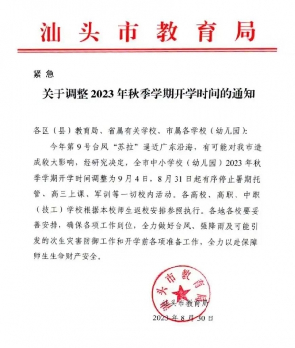 本周五是9月1日,原本是秋季学期开学日,受台风"苏拉"影响,昨天(8月30日)下午至晚间广东东莞、惠州、汕头、潮州、揭阳、汕尾、江门蓬江、恩平、江海、新会等地紧急发布通知:调整2023年秋季学期开学时间,大多延迟至9月4日开学!