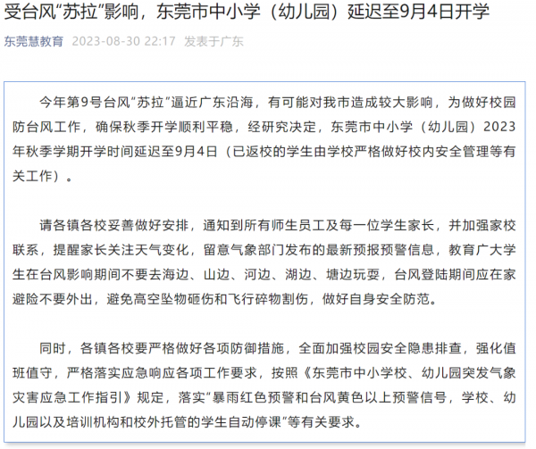 东莞市教育局通过官方微信公众号发布通知称:今年第9号台风"苏拉"逼近广东沿海,有可能对东莞造成较大影响,为做好校园防台风工作,确保秋季开学顺利平稳,经研究决定,东莞市中小学(幼儿园)2023年秋季学期开学时间延迟至9月4日,已返校的学生由学校严格做好校内安全管理等有关工作。