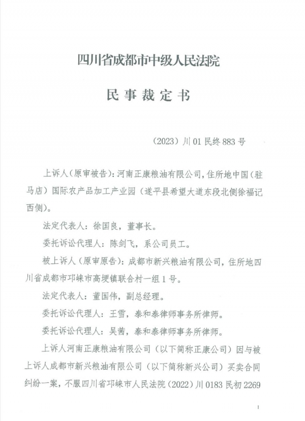 一审判决后,正康公司不服,随后向成都中院提起上诉。2023年8月9日,成都市中级人民法院作出二审裁定认为: 遂平县公安局于2022年8月4日对2022.07.08成都市新兴粮油公司有限公司涉嫌生产、销售伪劣产品案立案侦查,该案与本案系基于同一法律事实,根据《最高人民法院关于在审理经济纠纷案件中涉及经济犯罪嫌疑若干问题的规定》第十一条"人民法院作为经济纠纷受理的案件,经审理认为不属经济纠纷案件而有经济犯罪嫌疑的,应当裁定驳回起诉,将有关 材料移送公安机关或检察机关。"之规定,本案应裁定驳回起诉。综上,依照《最高人民法院关于适用< 中华人民共和国民事诉讼法>的解释》第三百二十八条规定,裁定如下: