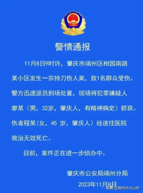 32岁的犯罪嫌疑人廖某(肇庆人),患有精神病,持菜刀砍杀45岁的受害女子程某(肇庆人),可经送往医院救治,受害女子无效死亡。