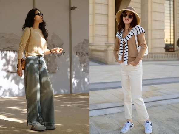 不过,如果你是属于梨形身材,那我有一个建议给你。像上方图左那位女性一样,你可以选择穿一件大地色的圆领针织衫,然后下半身搭配一条高腰的牛仔阔腿裤。这样的上紧下宽的穿搭技巧正好可以凸显你身材的优点,完美展现出你的魅力。不仅能显得更瘦更高,而且一双颜色与牛仔裤相呼应的单鞋,将整体造型统一又和谐。
