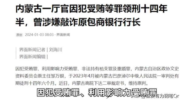 在内蒙古自治区政协前主任邹万银的案件中,我们发现了一场令人震惊的权力漩涡。这个故事不仅涉及权谋和金融腐败,更牵扯出一段错综复杂的情感纠葛。邹万银的一审判决被内蒙古高院二审裁定维持,这使得这场充满权谋、腐败和情感纷争的戏剧达到了一个更加紧凑而戏剧性的高潮。
