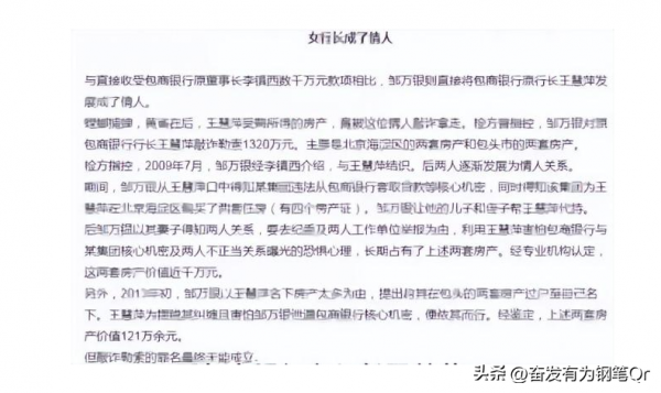 与此同时,邹万银与包商银行行长王慧萍之间的纠葛更是令案件增添了戏剧性的元素。两人逐渐发展为情人关系,而这段感情的发展过程中,牵扯到包商银行核心机密。邹万银以揭露两人关系为威胁,长期占有王慧萍在北京的两套价值近千万元的房产。