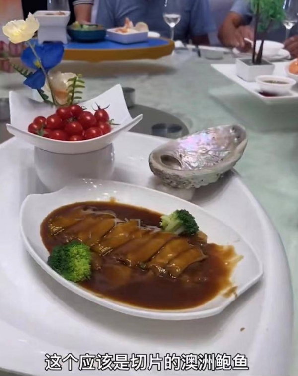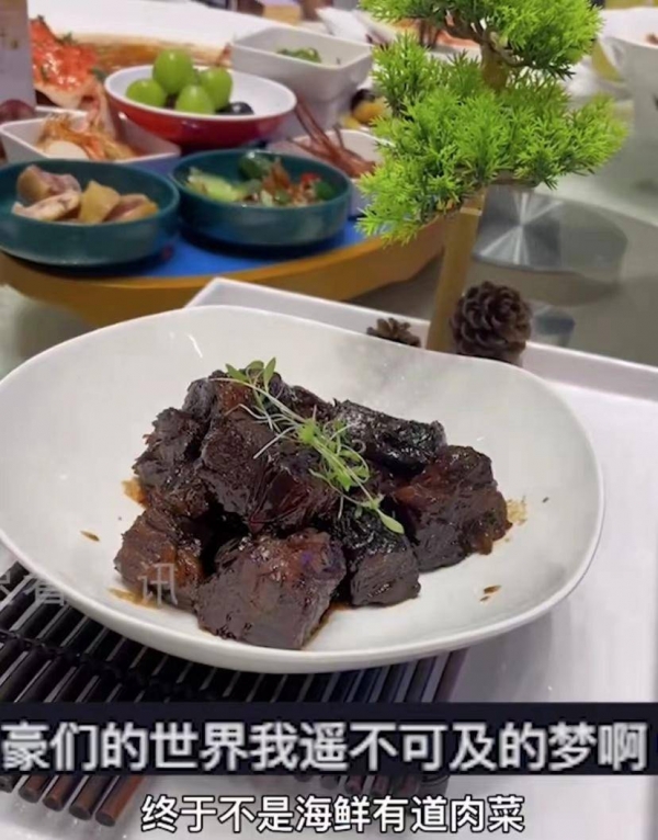 男子感叹:现在年轻人办婚礼,都喜欢这种比较新潮的菜,最后还有文火小牛肉,这是上面的海鲜大餐外,为数不多的肉菜,还有虫草花火腿炖老鸭。老年人最喜欢吃的大块红烧肉,色泽鲜润,入口即化。