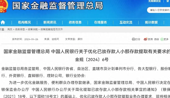 国家金融监督管理总局 中国人民银行关于优化已故存款人小额存款提取有关要求的通知,4月26日正式对外公布,正式实施的时间是2024年6月1日。