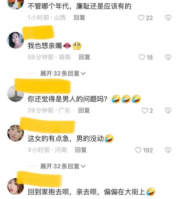 甚至还有网友说,这种只要自己不尴尬,尴尬的都是别人。成年人还是要注意影响。毕竟我们的社会还没有开放到接受男女在马路上搂搂抱抱,亲亲我我的地步。