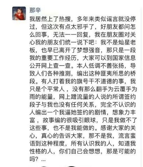 同时,网传那辛女士还发朋友圈澄清近期的谣言。表示多年来类似谣言就没停过,但 " 这次有点太邪乎了 "。她清楚指出自己不是灿星老板,也早已离开梦想强音。" 我只是个平常人,没有那么翻手为云覆手为雨的能量,网上蹭流量的人说的所谓签约段子与我也没有任何关系 ",她表示自己做不了这些事,也不是自己能做的。
