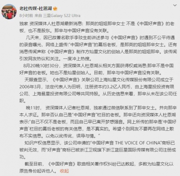 8 月 20 日资深媒体人杜恩湖深夜发文称那英的姐姐那辛女士并不是《好声音》的老板,也不是股东。两者之间并没有关联。杜恩湖在文中称从《中国好声音》关联公司的历史信息来看,那辛从未在该公司任职。他还表示自己还通过独家微信联系到了那辛女士,并向她求证,那辛女士否认自己是《好声音》节目的老板,而且称自己早已离开梦想强音,网络上疯传的有关好声音幕后老板的信息都是不真实的。