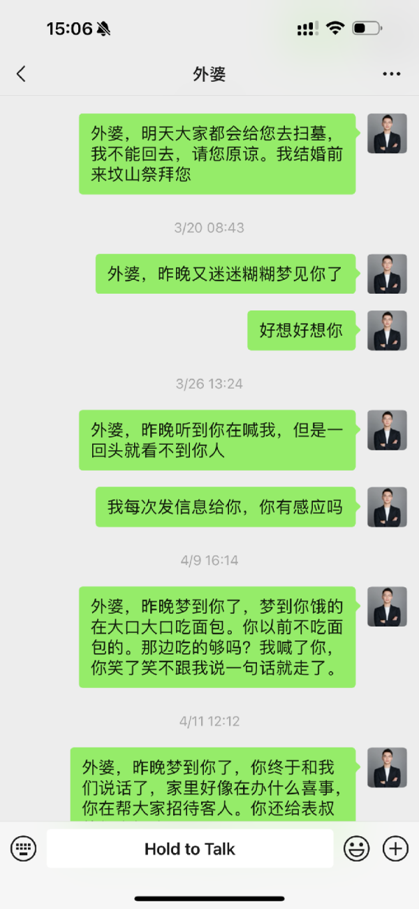 原来,王展的外婆于今年年初病逝。之后,因思念外婆,王展经常给外婆发送消息:"外婆,今天立春" "外婆,今天大年30,外面很热闹"" 外婆,昨晚又迷迷糊糊梦见你了,好想好想你"……4月24日,距离婚礼还有一周的时间,王展再次给外婆发消息,"外婆,如果你想来参加我们的婚礼,可以变成一只蝴蝶飞到我的肩膀上吗?这样我就知道是你来看我了,如果来了,一定要多停留一下,我们都很想你。"