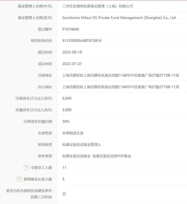 值得关注的是,今年9月19日,三井住友德思私募基金管理(上海)有限公司(三井住友德思资产管理股份有限公司的母公司是三井住友金融集团)正式在中国证券投资基金业协会完成登记备案。