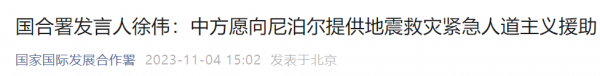 2023年11月4日,国家国际发展合作署新闻发言人徐伟表示,我们对尼泊尔西部地区地震造成人员伤亡和财产损失表示慰问和关切,愿根据尼政府和灾民需要提供紧急人道主义援助。