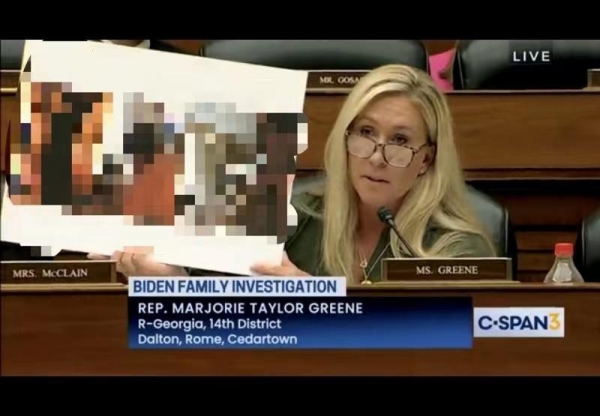 当轮到格林发言时,她先打了个预防针,表示自己接下来的照片很可能令人不安,建议家长谨慎观看,然后紧接着就掏出了一张拜登儿子的不雅照片。旁边还写着,"亨特通过他的律师事务所的银行账户雇来一名女子,并录下了两人的多段性爱视频"。