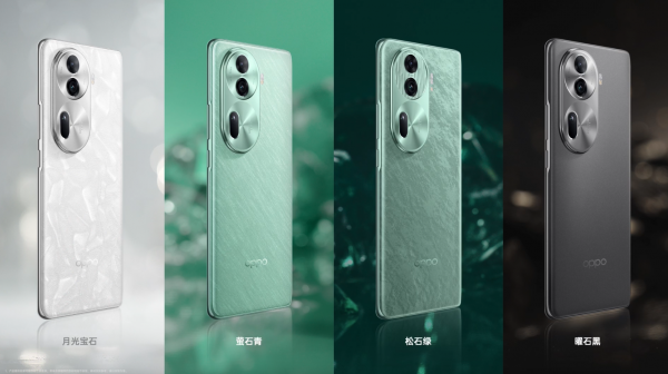 另外,OPPO Reno11系列提供了四款配色,其中,OPPO Reno11和OPPO Reno11 Pro均有"月光宝石"配色和"曜石黑"配色,而"萤石青"配色是OPPO Reno11专属,"松石绿"配色则是OPPO Reno11 Pro专属。