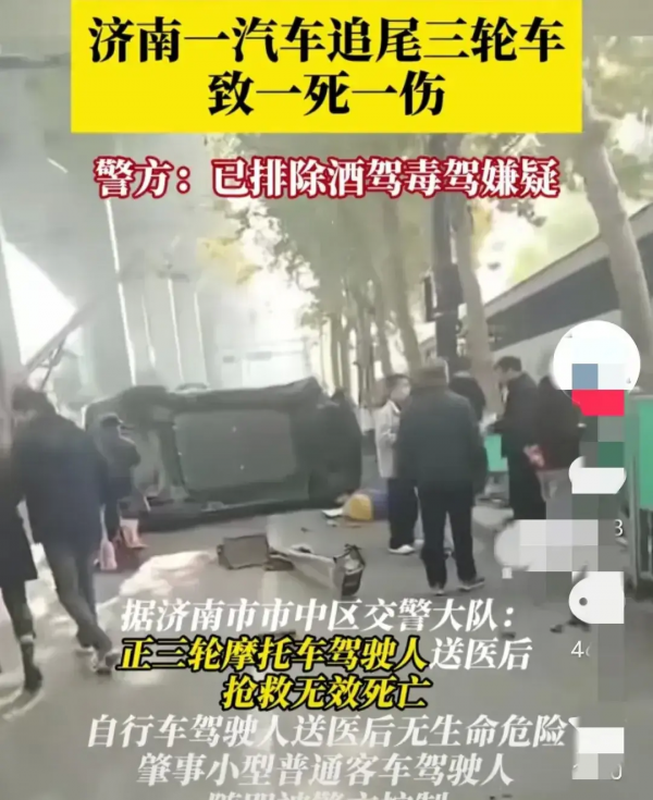 不过,很快警方进行了辟谣,肇事者已经被警方控制,并且排除了司机酒驾和毒驾嫌疑。真实的事件经过是,一辆汽车追尾一辆三轮车,然后三轮车又撞上前边的一辆自行车。事故导致三轮车驾驶人死亡,自行车驾驶人受伤。目前伤者已经被送往医院救治,暂无生命安全。