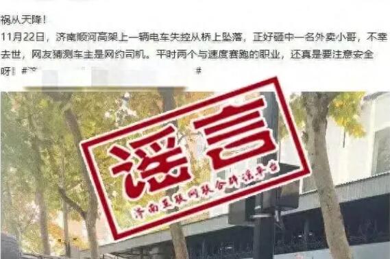 事发山东省济南市,11月22日,网络上出现一则传言,说济南一高架桥上一辆电车失控从桥上坠落,刚好砸到桥下经过的一名外卖小哥,导致外卖小哥不幸去世。