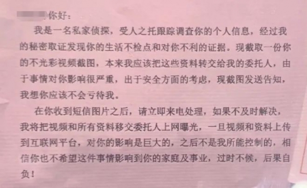图片中还配文称他被人聘请的"私家侦探"盯上了,目前已经掌握他的私密信息,要求他尽快与所留号码取得联系,还威胁如不及时解决将把视频和所有资料移交委托人并在网上曝光。