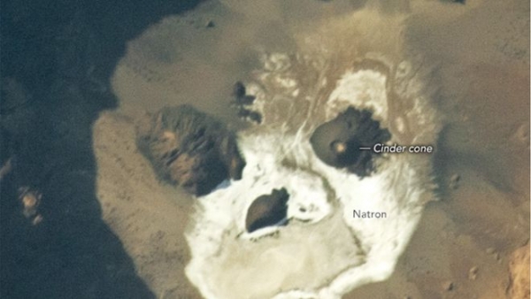 NASA认为,它实际上是一个深达1000米的火山坑,眼窝和鼻孔是火山口周围堆积的矿渣堆,形成陡峭的圆锥形山丘,而那些白色物质则是含有钠盐的矿物质。