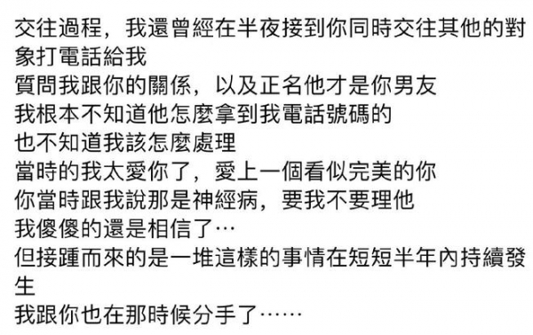 邱耀乐表示,在交往期间就曾在半夜接到其他与炎亚纶交往对象打来的电话,质问两人关系,以及正名他才是炎亚纶的男友。