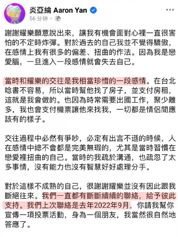 声明中,炎亚纶表示当初和邱耀乐交往时是真心的,他到现在还跟珍惜这段感情,两人分开后,彼此仍断断续续联系,上次联络时间为2022年9月。
