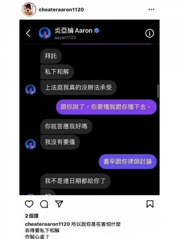 在事件被曝光后,炎亚纶第一时间想与邱耀乐私下和解,并在私信中以祈求的口吻拜托对方,称自己上法庭的话完全没办法承受。