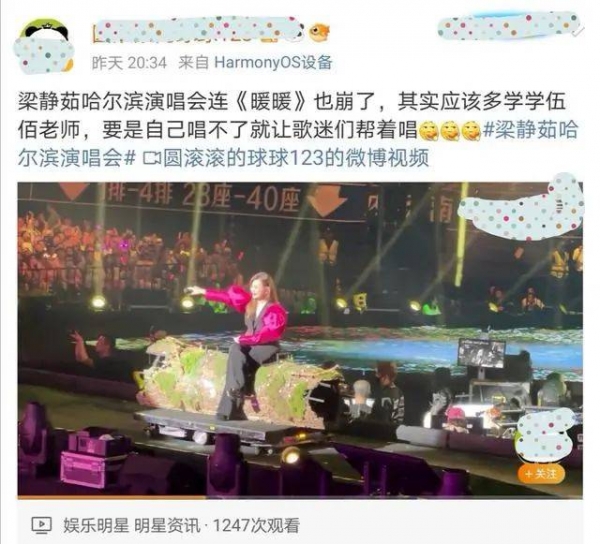 除了《燕尾蝶》翻车外,还有观众表示在前不久的哈尔滨演唱会上,梁静茹在唱《暖暖》时也崩了。