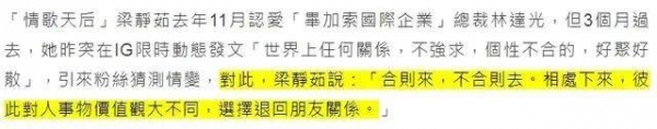 果真她又分手了,对于分手原因她说:"合则来,不合则去。相处下来,彼此对人事物价值观大不同,选择退回朋友关系。"