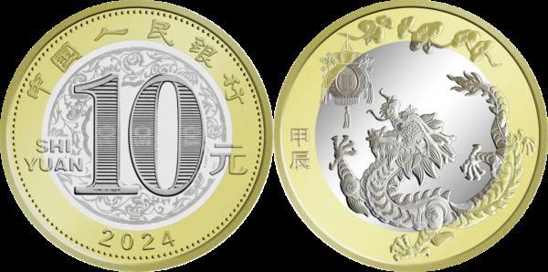 本次发行的2024年贺岁币面额10元,材质为双色铜合金,发行数量1.2亿枚,背面图案为中国传统剪纸艺术与装饰年画元素相结合的龙形象,衬以花灯和灵芝,币面左侧刊"甲辰"字样。